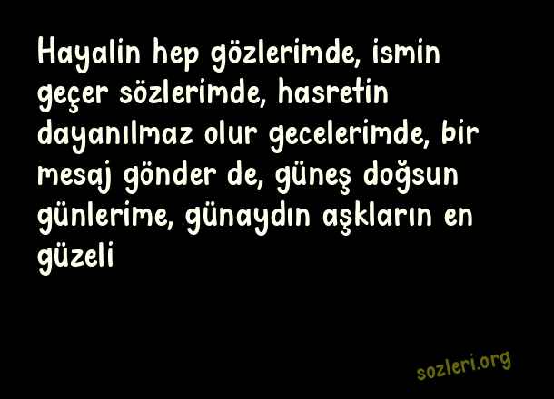 Hayalin hep gözlerimde, ismin geçer sözlerimde, hasretin dayanılmaz olur gecelerimde, bir mesaj gönder de, güneş doğsun günlerime, günaydın aşkların en güzeli ( Whatsapp Günaydın )