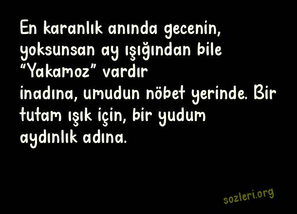 En karanlık anında gecenin, yoksunsan ay ışığından bile “Yakamoz” vardır inadına, umudun nöbet yerinde. Bir tutam ışık için, bir yudum aydınlık adına. ( Yakamoz )