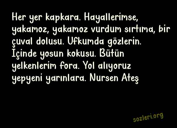 Her yer kapkara. Hayallerimse, yakamoz, yakamoz vurdum sırtıma, bir çuval dolusu. Ufkumda gözlerin. İçinde yosun kokusu. Bütün yelkenlerim fora. Yol alıyoruz yepyeni yarınlara. Nursen Ateş ( Yakamoz )