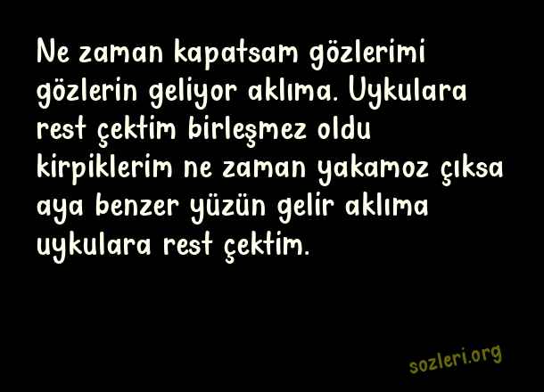 Ne zaman kapatsam gözlerimi gözlerin geliyor aklıma. Uykulara rest çektim birleşmez oldu kirpiklerim ne zaman yakamoz çıksa aya benzer yüzün gelir aklıma uykulara rest çektim. ( Yakamoz )