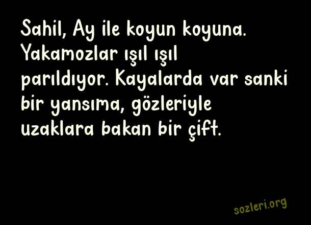 Sahil, Ay ile koyun koyuna. Yakamozlar ışıl ışıl parıldıyor. Kayalarda var sanki bir yansıma, gözleriyle uzaklara bakan bir çift. ( Yakamoz )