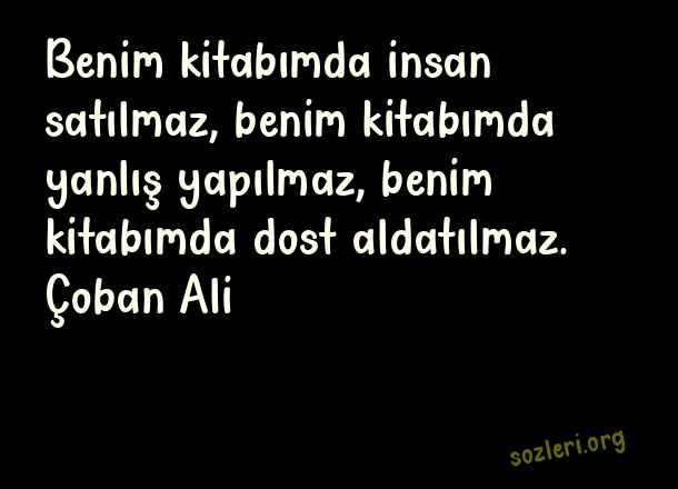 Benim kitabımda insan satılmaz, benim kitabımda yanlış yapılmaz, benim kitabımda dost aldatılmaz. Çoban Ali ( Yanlış Yapanlara Sözler )
