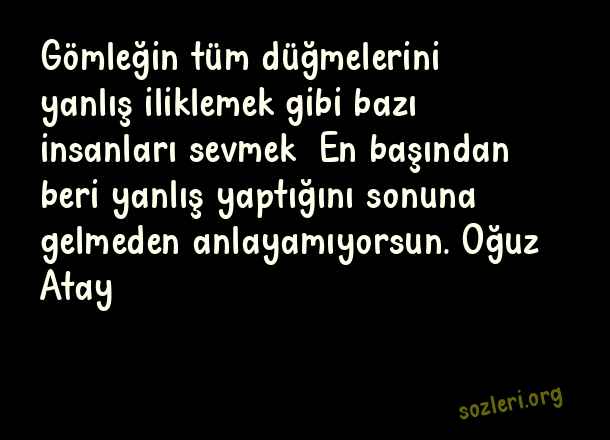 Gömleğin tüm düğmelerini yanlış iliklemek gibi bazı insanları sevmek… En başından beri yanlış yaptığını sonuna gelmeden anlayamıyorsun. Oğuz Atay ( Yanlış Anlaşılmak )