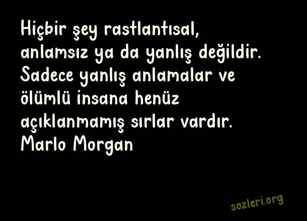 Hiçbir şey rastlantısal, anlamsız ya da yanlış değildir. Sadece yanlış anlamalar ve ölümlü insana henüz açıklanmamış sırlar vardır. Marlo Morgan ( Yanlış )
