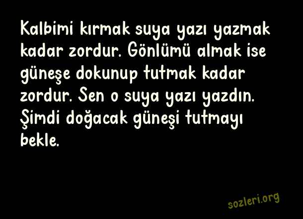 Kalbimi kırmak suya yazı yazmak kadar zordur. Gönlümü almak ise güneşe dokunup tutmak kadar zordur. Sen o suya yazı yazdın. Şimdi doğacak güneşi tutmayı bekle. ( Yanlış Yapanlara Sözler )