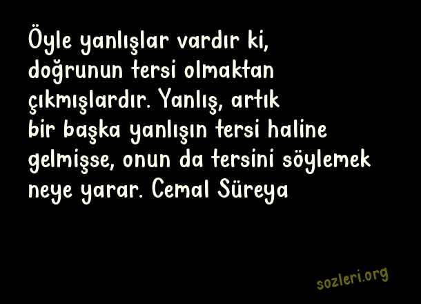 Öyle yanlışlar vardır ki, doğrunun tersi olmaktan çıkmışlardır. Yanlış, artık bir başka yanlışın tersi haline gelmişse, onun da tersini söylemek neye yarar. Cemal Süreya ( Yanlış )