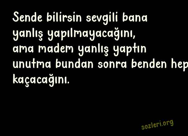 Sende bilirsin sevgili bana yanlış yapılmayacağını, ama madem yanlış yaptın unutma bundan sonra benden hep kaçacağını. ( Yanlış Yapanlara Sözler )