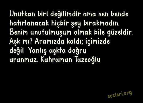 Unutkan biri değilimdir ama sen bende hatırlanacak hiçbir şey bırakmadın. Benim unutulmuşum olmak bile güzeldir. Aşk mı? Aramızda kaldı; içimizde değil… Yanlış aşkta doğru aranmaz. Kahraman Tazeoğlu ( Yanlış )