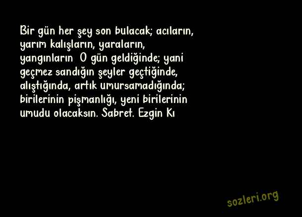 Bir gün her şey son bulacak; acıların, yarım kalışların, yaraların, yangınların… O gün geldiğinde; yani geçmez sandığın şeyler geçtiğinde, alıştığında, artık umursamadığında; birilerinin pişmanlığı, yeni birilerinin umudu olacaksın. Sabret. Ezgin Kı ( Yarım Kalmak )