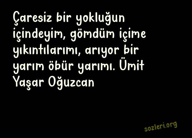 Çaresiz bir yokluğun içindeyim, gömdüm içime yıkıntılarımı, arıyor bir yarım öbür yarımı. Ümit Yaşar Oğuzcan ( Yarım Kalmak )