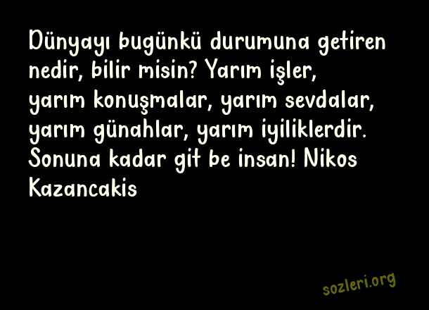 Dünyayı bugünkü durumuna getiren nedir, bilir misin? Yarım işler, yarım konuşmalar, yarım sevdalar, yarım günahlar, yarım iyiliklerdir. Sonuna kadar git be insan! Nikos Kazancakis ( Yarım Kalmak )