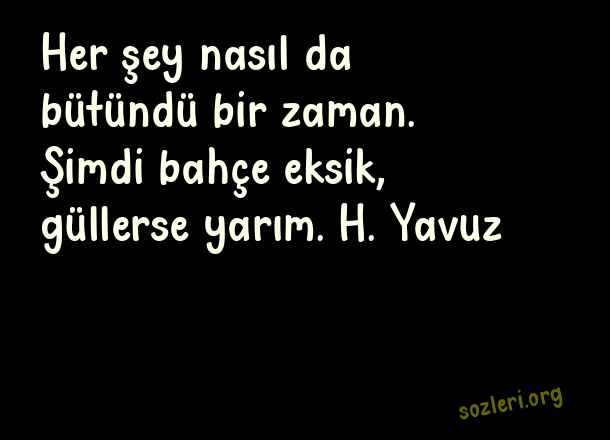 Her şey nasıl - Yarım Kalmak İle İlgili Sözler .. Her şey nasıl da bütündü bir zaman. Şimdi bahçe eksik, güllerse yarım. H. Yavuz ( Yarım Kalmak )
