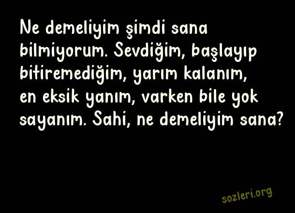 Ne demeliyim şimdi sana bilmiyorum. Sevdiğim, başlayıp bitiremediğim, yarım kalanım, en eksik yanım, varken bile yok sayanım. Sahi, ne demeliyim sana? ( Yarım Kalmak )