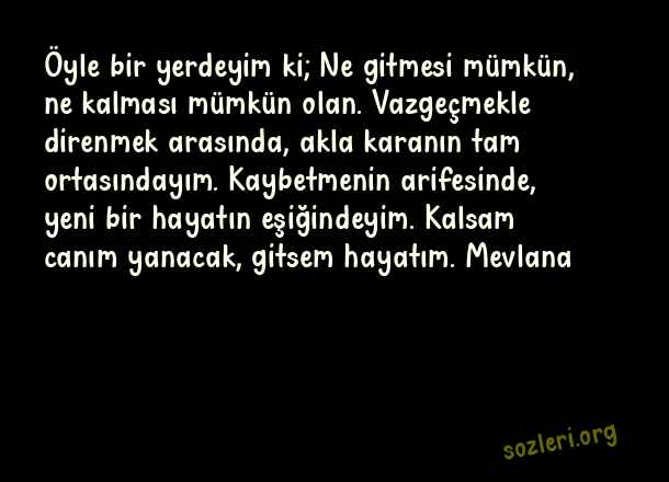 Öyle bir yerdeyim ki; Ne gitmesi mümkün, ne kalması mümkün olan. Vazgeçmekle direnmek arasında, akla karanın tam ortasındayım. Kaybetmenin arifesinde, yeni bir hayatın eşiğindeyim. Kalsam canım yanacak, gitsem hayatım. Mevlana ( Yarım Kalmak )