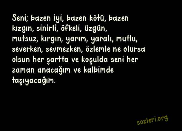 Seni; bazen iyi, bazen kötü, bazen kızgın, sinirli, öfkeli, üzgün, mutsuz, kırgın, yarım, yaralı, mutlu, severken, sevmezken, özlemle ne olursa olsun her şartta ve koşulda seni her zaman anacağım ve kalbimde taşıyacağım. ( Yarım Kalmak )