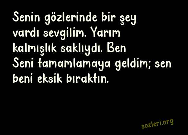 Senin gözlerinde bir şey vardı sevgilim. Yarım kalmışlık saklıydı. Ben Seni tamamlamaya geldim; sen beni eksik bıraktın. ( Yarım Kalmak )