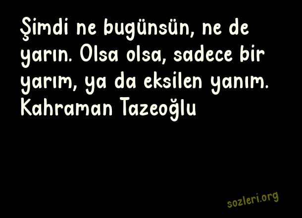 Şimdi ne bugünsün, ne de yarın. Olsa olsa, sadece bir yarım, ya da eksilen yanım. Kahraman Tazeoğlu ( Yarım Kalmak )