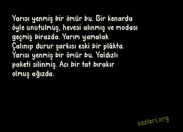 Yarısı yenmiş bir ömür bu. Bir kenarda öyle unutulmuş, hevesi alınmış ve modası geçmiş birazda. Yarım yamalak… Çalınıp durur şarkısı eski bir plâkta. Yarısı yenmiş bir ömür bu. Yaldızlı paketi silinmiş. Acı bir tat bırakır olmuş ağızda. ( Yarım Kalmak )