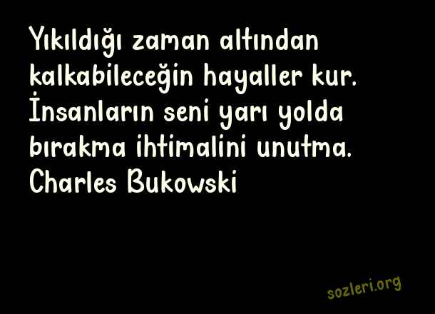 Yıkıldığı zaman altından kalkabileceğin hayaller kur. İnsanların seni yarı yolda bırakma ihtimalini unutma. Charles Bukowski ( Yarım Kalmak )