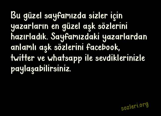 Bu güzel sayfamızda sizler için yazarların en güzel aşk sözlerini hazırladık. Sayfamızdaki yazarlardan anlamlı aşk sözlerini facebook, twitter ve whatsapp ile sevdiklerinizle paylaşabilirsiniz. ( Yazarlardan Aşk )