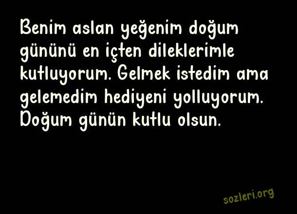 Benim aslan yeğenim doğum gününü en içten dileklerimle kutluyorum. Gelmek istedim ama gelemedim hediyeni yolluyorum. Doğum günün kutlu olsun. ( Yeğene Doğum Günü )