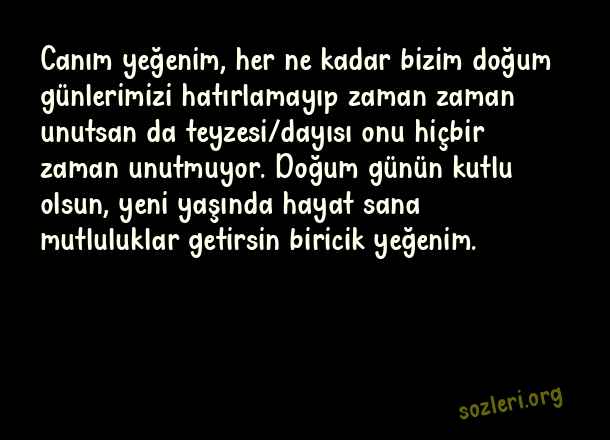 Canım yeğenim, her ne kadar bizim doğum günlerimizi hatırlamayıp zaman zaman unutsan da teyzesi/dayısı onu hiçbir zaman unutmuyor. Doğum günün kutlu olsun, yeni yaşında hayat sana mutluluklar getirsin biricik yeğenim. ( Yeğene Doğum Günü )