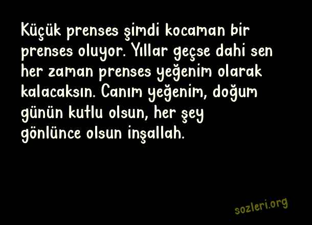 Küçük prenses şimdi kocaman bir prenses oluyor. Yıllar geçse dahi sen her zaman prenses yeğenim olarak kalacaksın. Canım yeğenim, doğum günün kutlu olsun, her şey gönlünce olsun inşallah. ( Yeğene Doğum Günü )
