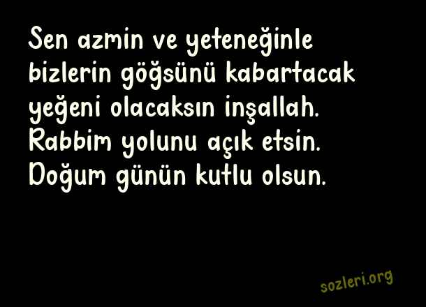 Sen azmin ve yeteneğinle bizlerin göğsünü kabartacak yeğeni olacaksın inşallah. Rabbim yolunu açık etsin. Doğum günün kutlu olsun. ( Yeğene Doğum Günü )