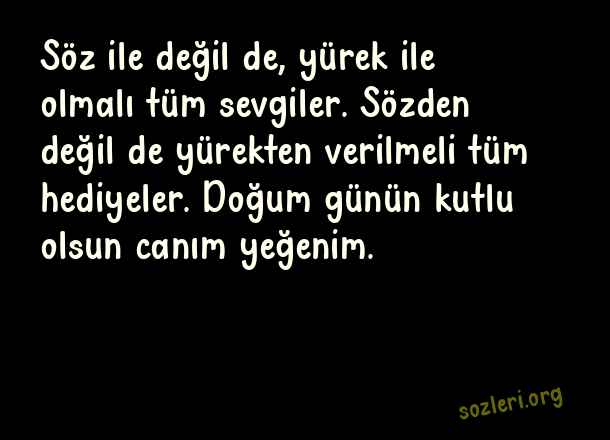 Söz ile değil de, yürek ile olmalı tüm sevgiler. Sözden değil de yürekten verilmeli tüm hediyeler. Doğum günün kutlu olsun canım yeğenim. ( Yeğene Doğum Günü )