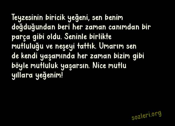 Teyzesinin biricik yeğeni, sen benim doğduğundan beri her zaman canımdan bir parça gibi oldu. Seninle birlikte mutluluğu ve neşeyi tattık. Umarım sen de kendi yaşamında her zaman bizim gibi böyle mutluluk yaşarsın. Nice mutlu yıllara yeğenim! ( Yeğene Doğum Günü )