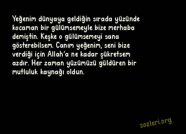 Yeğenim dünyaya geldiğin sırada yüzünde kocaman bir gülümsemeyle bize merhaba demiştin. Keşke o gülümsemeyi sana gösterebilsem. Canım yeğenim, seni bize verdiği için Allah’a ne kadar şükretsem azdır. Her zaman yüzümüzü güldüren bir mutluluk kaynağı oldun. ( Yeğene Doğum Günü )