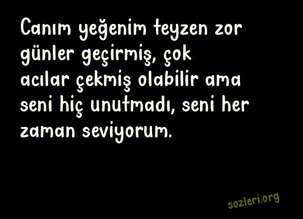 Canım yeğenim teyzen zor günler geçirmiş, çok acılar çekmiş olabilir ama seni hiç unutmadı, seni her zaman seviyorum. ( Yeğene Güzel Sözler )