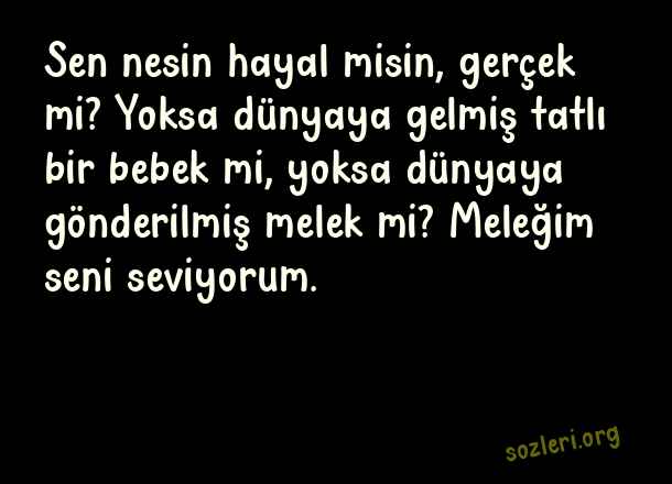 Sen nesin hayal misin, gerçek mi? Yoksa dünyaya gelmiş tatlı bir bebek mi, yoksa dünyaya gönderilmiş melek mi? Meleğim seni seviyorum. ( Yeğene Güzel Sözler )