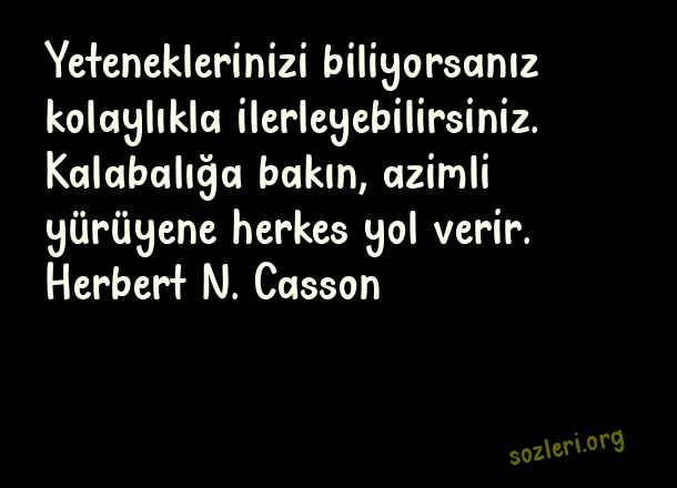 Yeteneklerinizi biliyorsanız kolaylıkla ilerleyebilirsiniz. Kalabalığa bakın, azimli yürüyene herkes yol verir. Herbert N. Casson ( Yetenek )
