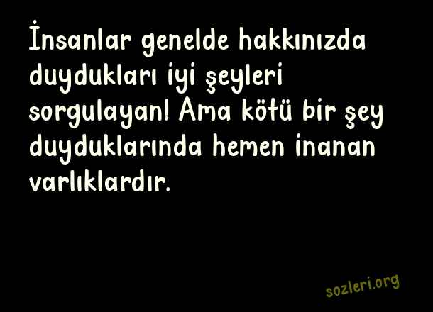 İnsanlar genelde hakkınızda duydukları iyi şeyleri sorgulayan! Ama kötü bir şey duyduklarında hemen inanan varlıklardır. ( Yıkıcı Sözler )