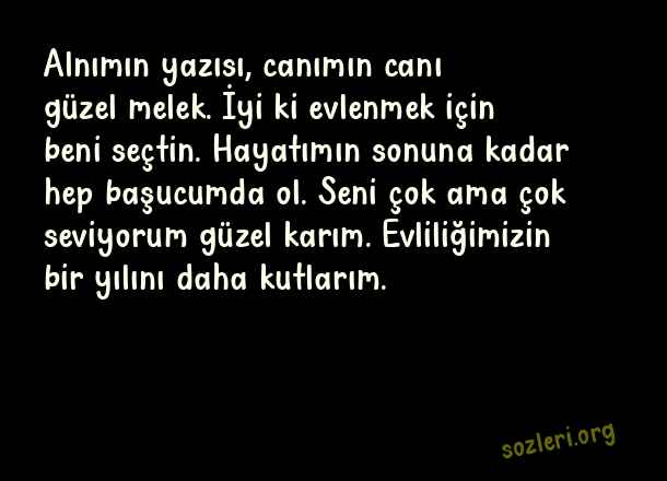 Alnımın yazısı, canımın canı güzel melek. İyi ki evlenmek için beni seçtin. Hayatımın sonuna kadar hep başucumda ol. Seni çok ama çok seviyorum güzel karım. Evliliğimizin bir yılını daha kutlarım. ( Evlilik Yıldönümü )