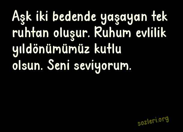 Aşk iki bedende yaşayan tek ruhtan oluşur. Ruhum evlilik yıldönümümüz kutlu olsun. Seni seviyorum. ( Evlilik Yıldönümü )