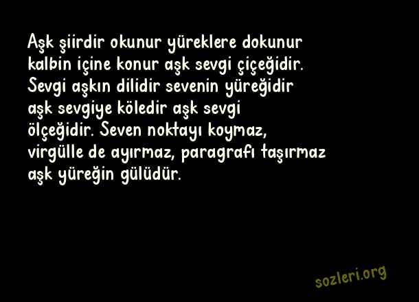 Aşk şiirdir okunur yüreklere dokunur kalbin içine konur aşk sevgi çiçeğidir. Sevgi aşkın dilidir sevenin yüreğidir aşk sevgiye köledir aşk sevgi ölçeğidir. Seven noktayı koymaz, virgülle de ayırmaz, paragrafı taşırmaz aşk yüreğin gülüdür. ( Evlilik Yıldönümü )
