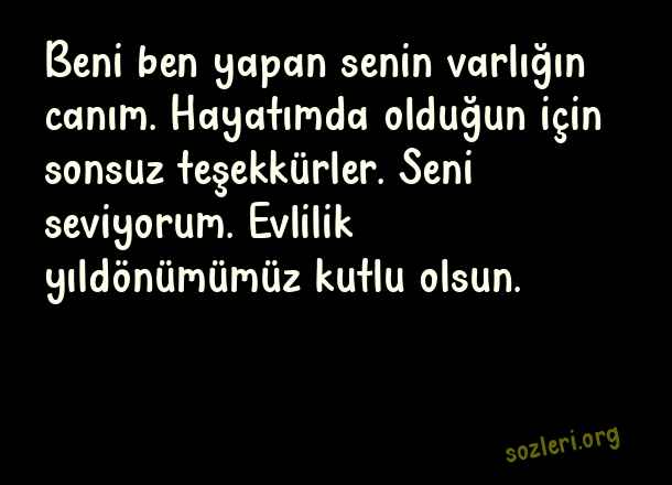 Beni ben yapan senin varlığın canım. Hayatımda olduğun için sonsuz teşekkürler. Seni seviyorum. Evlilik yıldönümümüz kutlu olsun. ( Evlilik Yıldönümü )
