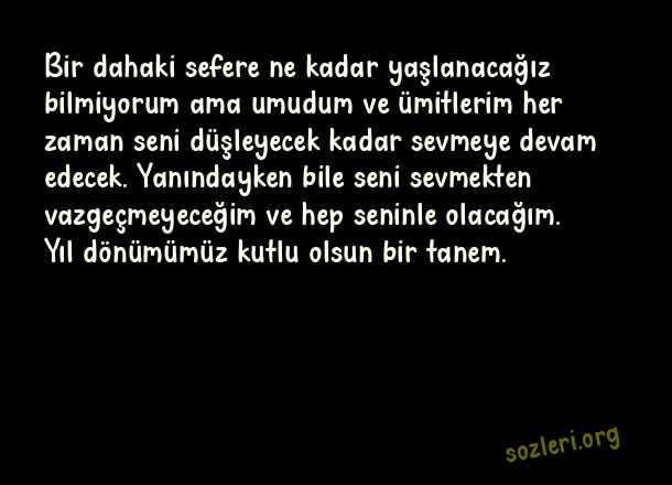 Bir dahaki sefere ne kadar yaşlanacağız bilmiyorum ama umudum ve ümitlerim her zaman seni düşleyecek kadar sevmeye devam edecek. Yanındayken bile seni sevmekten vazgeçmeyeceğim ve hep seninle olacağım. Yıl dönümümüz kutlu olsun bir tanem. ( Yıldönümü )