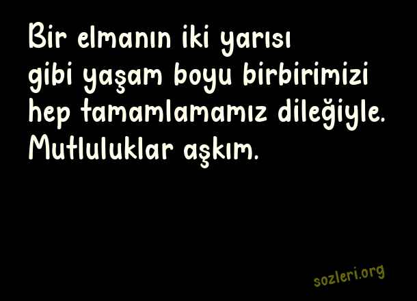 Bir elmanın iki yarısı gibi yaşam boyu birbirimizi hep tamamlamamız dileğiyle. Mutluluklar aşkım. ( Evlilik Yıldönümü )