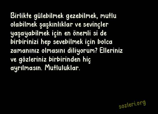Birlikte gülebilmek gezebilmek, mutlu olabilmek şaşkınlıklar ve sevinçler yaşayabilmek için en önemli si de birbirinizi hep sevebilmek için bolca zamanınız olmasını diliyorum? Elleriniz ve gözleriniz birbirinden hiç ayrılmasın. Mutluluklar. ( Evlilik Yıldönümü )