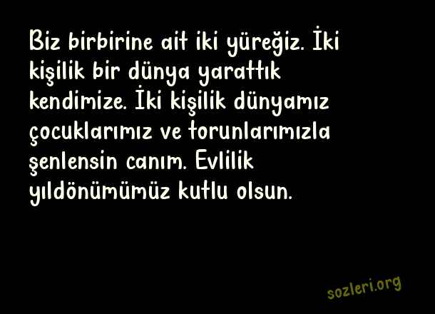 Biz birbirine ait iki yüreğiz. İki kişilik bir dünya yarattık kendimize. İki kişilik dünyamız çocuklarımız ve torunlarımızla şenlensin canım. Evlilik yıldönümümüz kutlu olsun. ( Evlilik Yıldönümü )