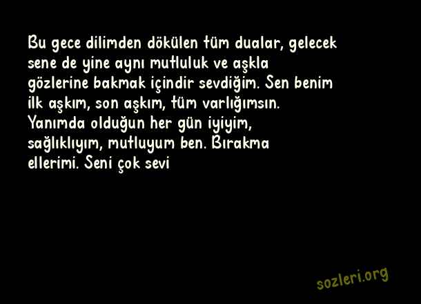 Bu gece dilimden dökülen tüm dualar, gelecek sene de yine aynı mutluluk ve aşkla gözlerine bakmak içindir sevdiğim. Sen benim ilk aşkım, son aşkım, tüm varlığımsın. Yanımda olduğun her gün iyiyim, sağlıklıyım, mutluyum ben. Bırakma ellerimi. Seni çok sevi ( Sevgiliye Yıldönümü )