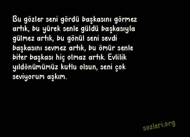 Bu gözler seni gördü başkasını görmez artık, bu yürek senle güldü başkasıyla gülmez artık, bu gönül seni sevdi başkasını sevmez artık, bu ömür senle biter başkası hiç olmaz artık. Evlilik yıldönümümüz kutlu olsun, seni çok seviyorum aşkım. ( Evlilik Yıldönümü )