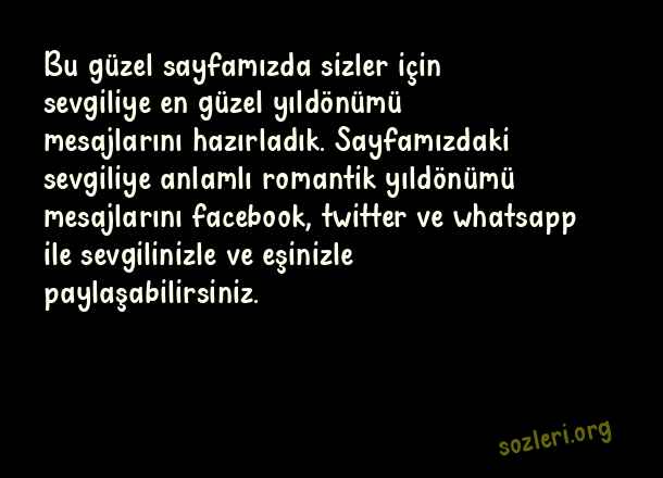 Bu güzel sayfamızda sizler için sevgiliye en güzel yıldönümü mesajlarını hazırladık. Sayfamızdaki sevgiliye anlamlı romantik yıldönümü mesajlarını facebook, twitter ve whatsapp ile sevgilinizle ve eşinizle paylaşabilirsiniz. ( Sevgiliye Yıldönümü )