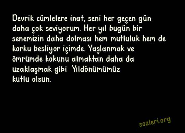 Devrik cümlelere inat, seni her geçen gün daha çok seviyorum. Her yıl bugün bir senemizin daha dolması hem mutluluk hem de korku besliyor içimde. Yaşlanmak ve ömrümde kokunu almaktan daha da uzaklaşmak gibi… Yıldönümümüz kutlu olsun. ( Yıldönümü )