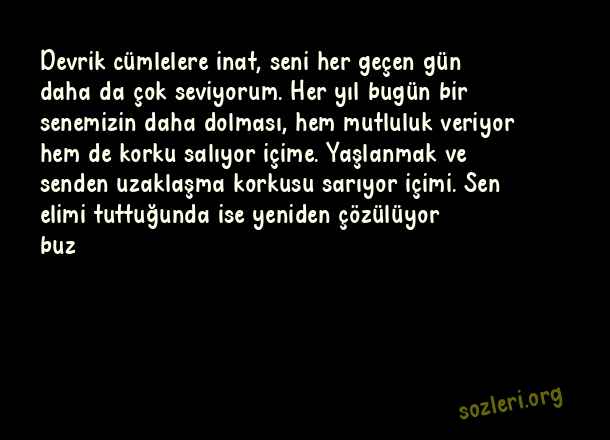 Devrik cümlelere inat, seni her geçen gün daha da çok seviyorum. Her yıl bugün bir senemizin daha dolması, hem mutluluk veriyor hem de korku salıyor içime. Yaşlanmak ve senden uzaklaşma korkusu sarıyor içimi. Sen elimi tuttuğunda ise yeniden çözülüyor buz ( Sevgiliye Yıldönümü )