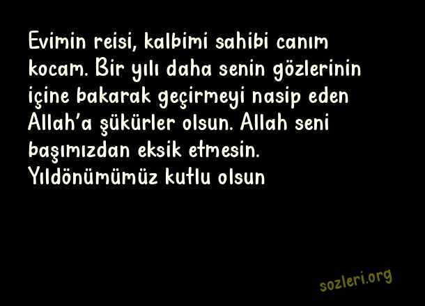 Evimin reisi, kalbimi sahibi canım kocam. Bir yılı daha senin gözlerinin içine bakarak geçirmeyi nasip eden Allah’a şükürler olsun. Allah seni başımızdan eksik etmesin. Yıldönümümüz kutlu olsun… ( Kocaya Evlilik Yıldönümü )