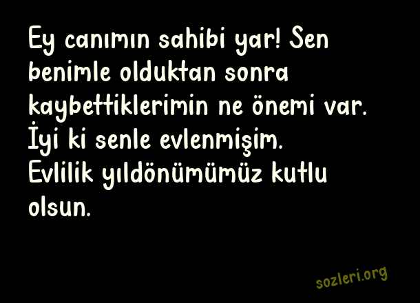 Ey canımın sahibi yar! Sen benimle olduktan sonra kaybettiklerimin ne önemi var. İyi ki senle evlenmişim. Evlilik yıldönümümüz kutlu olsun. ( Yıldönümü )
